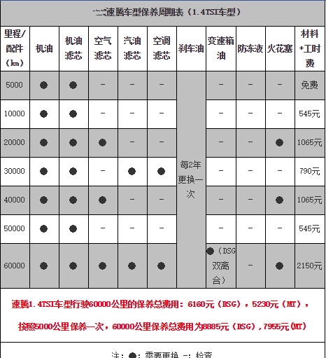 而对于1.4T的速腾来说,首保和1.6T的时间以及项目是一样的,首保同样是免费的,而二保的时间则与1.6T的有所不同,1.4T的二保时间在10000公里左右,保养项目也与首保项目是一致的,保养的费用大概为545元。