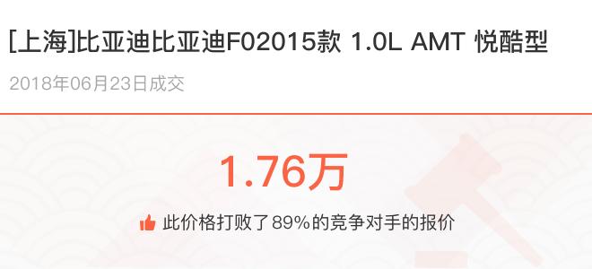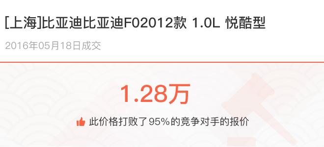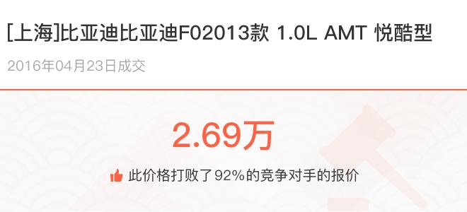 一辆开了3年3.1万公里的二手车还值多少钱?上海车主看到朋友换了辆新车,也想把自己的比亚迪比亚迪F0卖掉换辆新的,却不知道这辆行驶了3.1万公里的旧车到底还能卖多少钱?下面一起来看下开了不同公里数的比亚迪比亚迪F0在二手车拍卖平台上卖了多少钱: