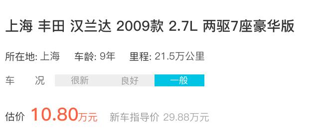 该款车2009年上牌启用,行驶21.5万公里,新车指导价29.88万元,车况一般的情况下,成交价11.70万。
