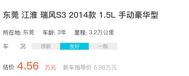 该款车2015年上牌启用,行驶3.2万公里,新车指导价6.98万元,车况良好的情况下,成交价3.59万。