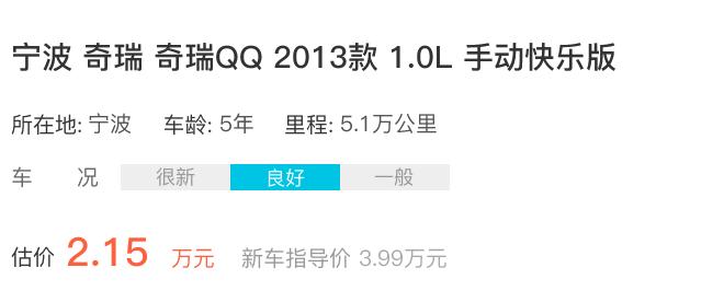 该款车2013年上牌启用,行驶5.1万公里,新车指导价3.99万元,车况良好的情况下,成交价0.90万。