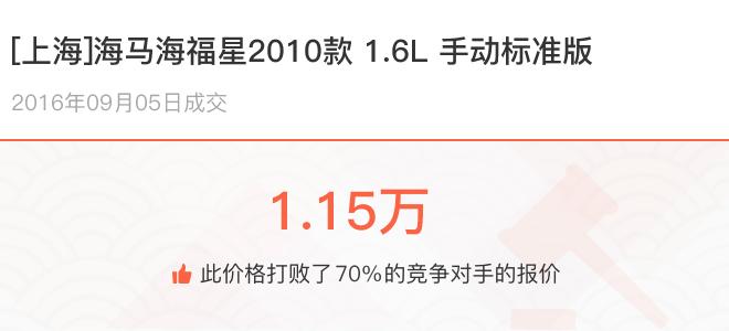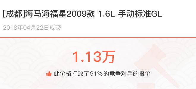 一辆开了9年6.5万公里的二手车还值多少钱?成都车主看到朋友换了辆新车,也想把自己的海马海福星卖掉换辆新的,却不知道这辆行驶了6.5万公里的旧车到底还能卖多少钱?下面一起来看下开了不同公里数的海马海福星在二手车拍卖平台上卖了多少钱: