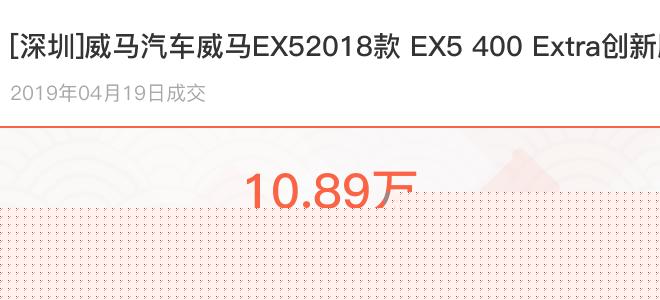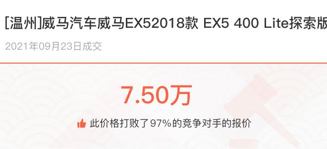 下面一起来看下开了不同公里数的威马汽车威马EX5在二手车拍卖平台上卖了多少钱: