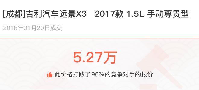 下面一起来看下开了不同公里数的吉利汽车远景X3在二手车拍卖平台上卖了多少钱: