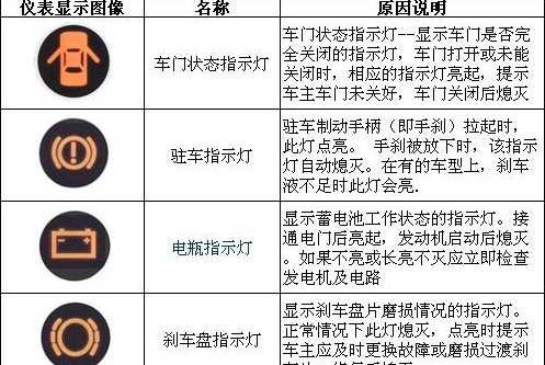 8、刹车盘指示灯:用来显示车辆刹车盘磨损的状况。一般,该指示灯为熄灭状态,当刹车盘出现故障或磨损过度时,该灯点亮,修复后熄灭。