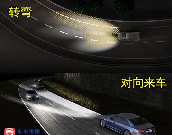 ①自适应大灯又称为动态调节弯道灯。它可以依据转向角度大小以及车速情况智能调节车灯的高低。自适应大灯在转向角度超过一定值且接通了转向灯时会自动打开。该灯在车速不超过70km/h时工作。在挂入倒档时,车两侧的的转弯灯都接通。