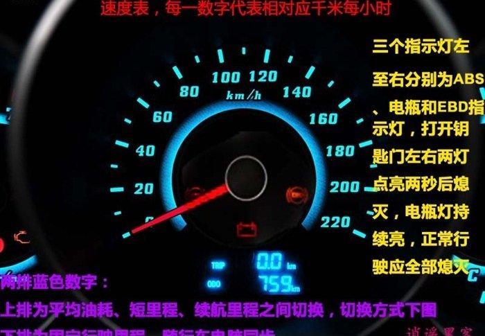 以下是长按逸动的仪表指示灯以及图解。下表是速度表部分,中间有三个指示灯,从左往右分别是ABS、电瓶和EBD指示灯,打开钥匙门左右两灯点亮两秒后熄灭,电瓶灯持续亮,正常行驶应全部熄灭。