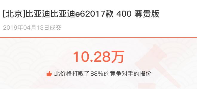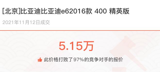 一辆开了5年5.9万公里的二手车还值多少钱?北京车主看到朋友换了辆新车,也想把自己的比亚迪比亚迪e6卖掉换辆新的,却不知道这辆行驶了5.9万公里的旧车到底还能卖多少钱?下面一起来看下开了不同公里数的比亚迪比亚迪e6在二手车拍卖平台上卖了多少钱: