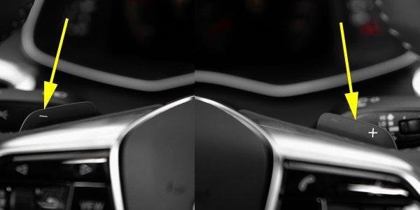 刹车踏板先踩死,换入“D”档,而往右边推动档位把手。这时开始就能利用换挡拨片进行手动加减档,“+”拨片代表加档,“-”拨片代表降档。手动模式虽然繁琐一些,不过可以精确控制合适转速与扭矩时的档位切换。