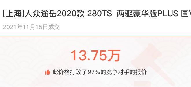 下面一起来看下开了不同公里数的大众途岳在二手车拍卖平台上卖了多少钱:
