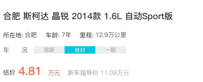 该款车2014年上牌启用,行驶12.9万公里,新车指导价11.08万元,车况良好的情况下,成交价4.25万。