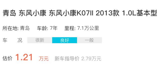 该款车2014年上牌启用,行驶7.1万公里,新车指导价2.79万元,车况良好的情况下,成交价0.25万。