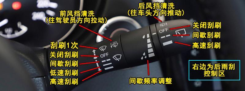 ③往下拨杆,逐渐增大雨刮器的工作频率。▁ ▁为间歇档 ▁为低速挡,▄为高速挡。