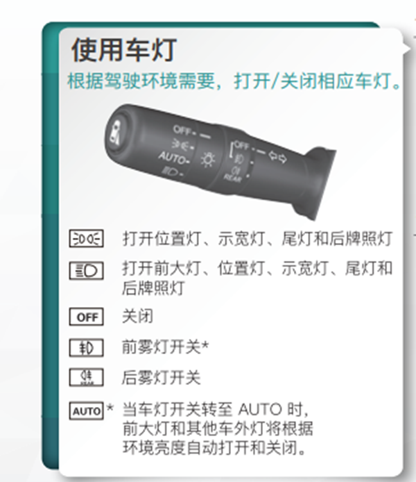 按键的AUTO指示灯亮起,代表自动大灯正在工作。旋转旋钮可切换自动大灯,近光灯与示宽灯。