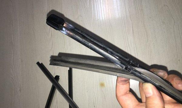 ②接着松开固定雨刮片的两个卡扣,将老旧的胶条拔出。(在打开紧固件时不能用力过度,记住两端的塑料罩不能拆卸。)