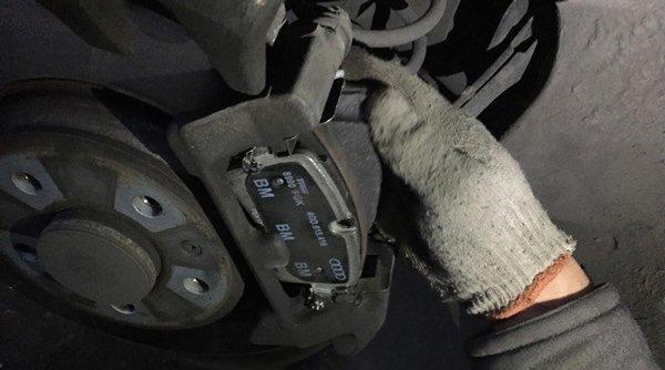 ③此时可以拿开制动钳盖罩,将新的刹车片放置好。将有文字标识的一面朝向外头,无生产文字标签的一面朝向里头。