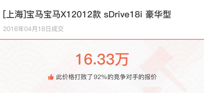 一辆开了4年8.8万公里的二手车还值多少钱?上海车主看到朋友换了辆新车,也想把自己的宝马宝马X1卖掉换辆新的,却不知道这辆行驶了8.8万公里的旧车到底还能卖多少钱?下面一起来看下开了不同公里数的宝马宝马X1在二手车拍卖平台上卖了多少钱: